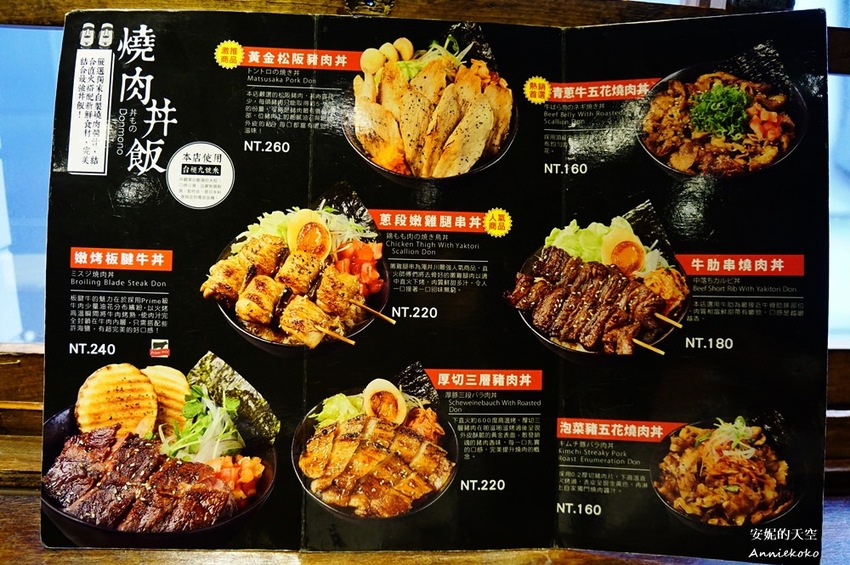 直火人燒肉丼飯的總類很多,人氣第一名就是黃金松阪豬肉丼跟青蔥牛五花燒肉丼,以及蔥段嫩雞腿串丼,其餘的燒肉丼也都很豐富,配菜也都不同。