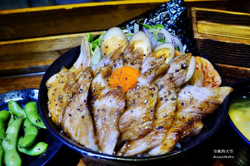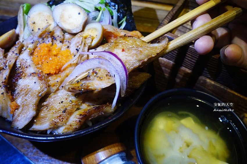 一頭豬裡頭只有5-7兩的松阪豬,而這碗丼飯竟然將松阪豬層層疊疊鋪好鋪滿,第一次看到松阪豬是以這樣的豪邁姿態登場,心裡的激動可是掀起波濤駭浪啊。