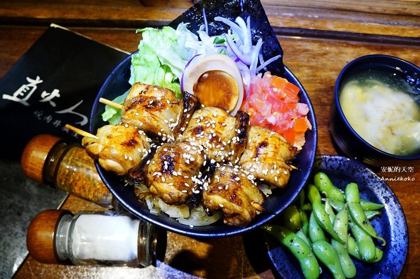 這好像是串燒店裡才有的烤雞腿串,沒想到在直火人丼飯裡就能吃到,燒烤的醬汁充分與雞腿肉結合,跟蔥段一起搭配食用,鹹香的氣味很是涮口。