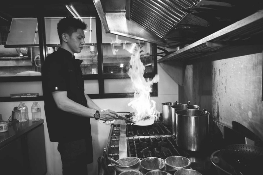 主廚將川味靈魂的花椒及自製提煉的紅油,拌炒帶出紅油的辣勁及花椒的麻