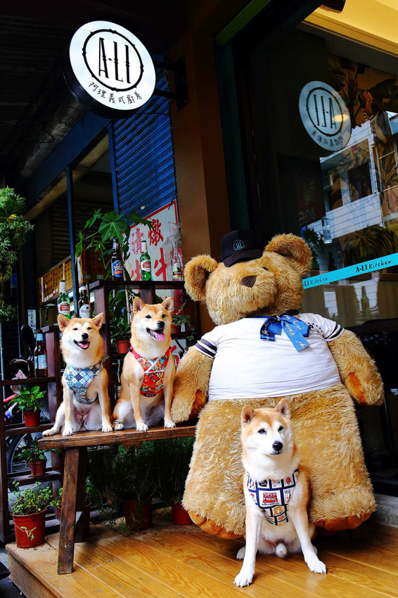 餐廳的門口有一隻大熊在迎接每一位客人, 歡迎毛小孩一同進入,需要裝在推車籃(車)中唷