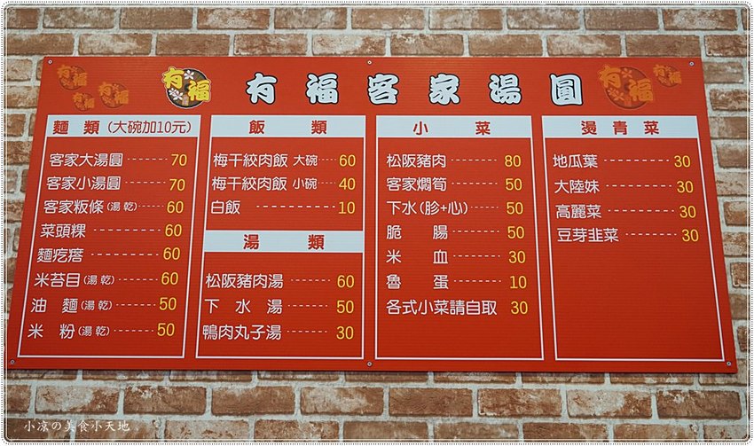有福客家湯圓店招牌上寫著販售的餐點有客家湯圓、麵疙瘩、梅干絞肉飯、菜頭粿
