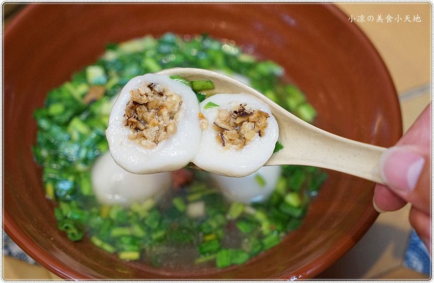 有著斗大的招牌上寫著客家湯圓,圖片呈現了鹹湯圓的美味模樣