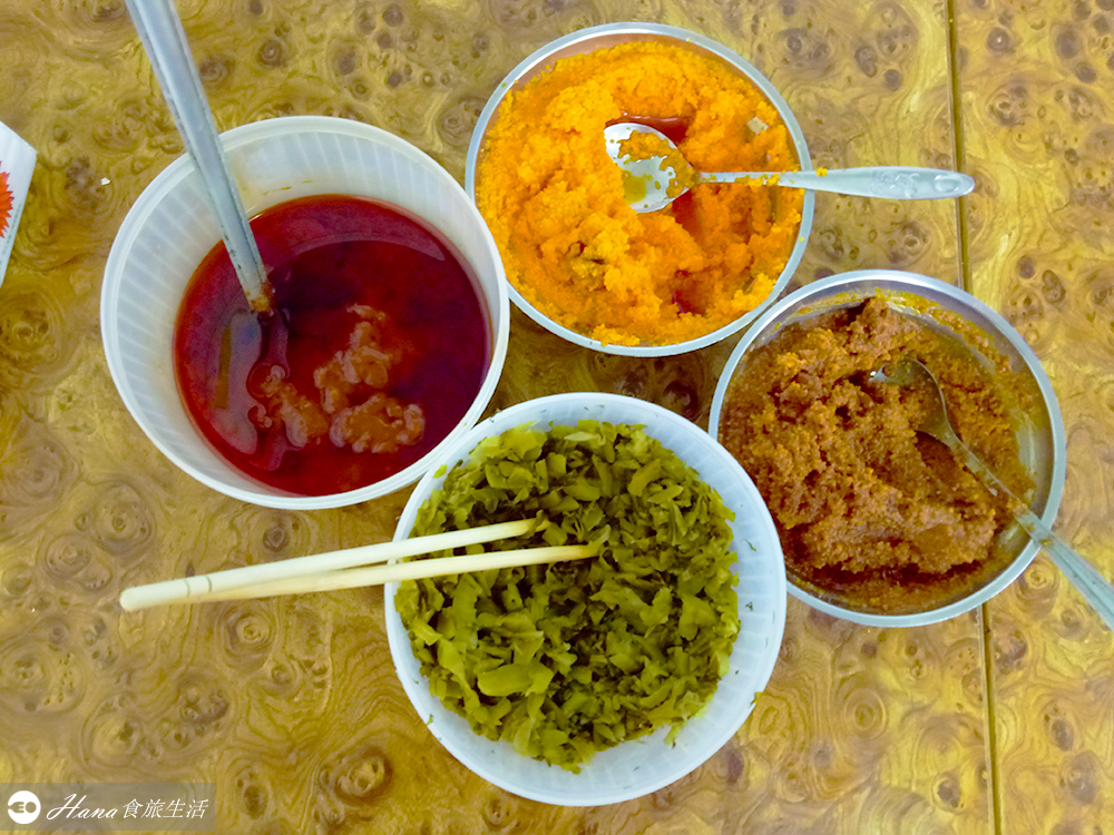 ▲桌上有酸菜、牛油、辣油,其中牛油橘黃色的是不辣,