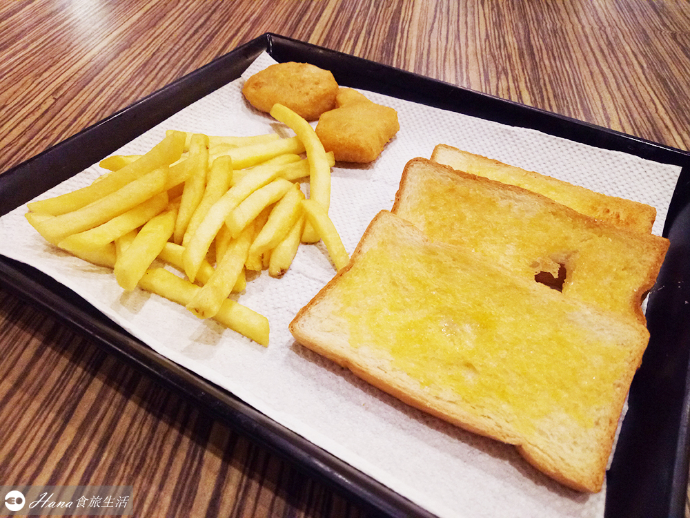 ▲點排餐附贈的點心盤,包含雞塊、薯條和奶酥吐司,