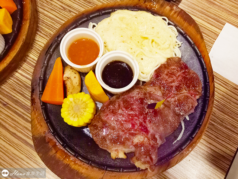 隨餐附義大利麵、玉米、地瓜、 杏鮑菇、紅蘿蔔、蘑菇醬和黑胡椒醬,