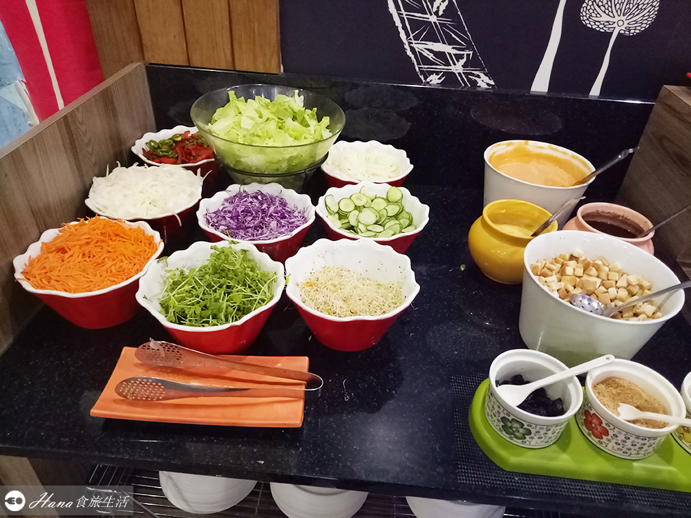 ▲沙拉吧,共有9樣生菜沙拉、3種沙拉醬可以選,
