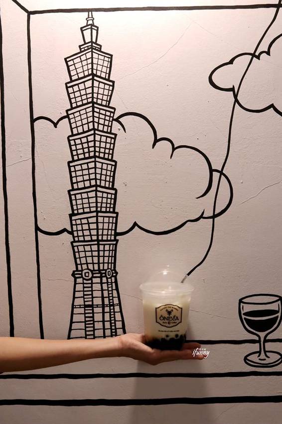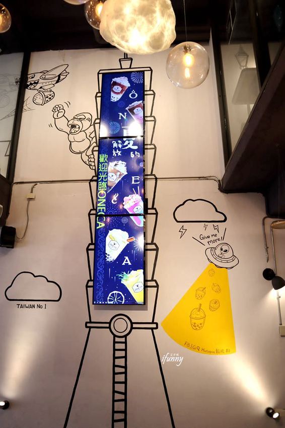 直達二樓表達出台灣第一的台北101,一旁搭配的是詼諧的外星人飛碟及巨猩,而且都是為了爭奪珍珠飲品的畫面,實在令人會心一笑!