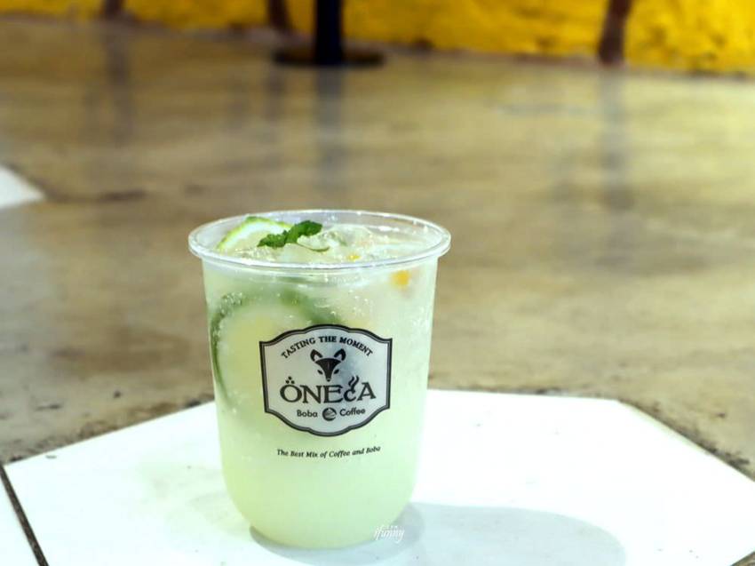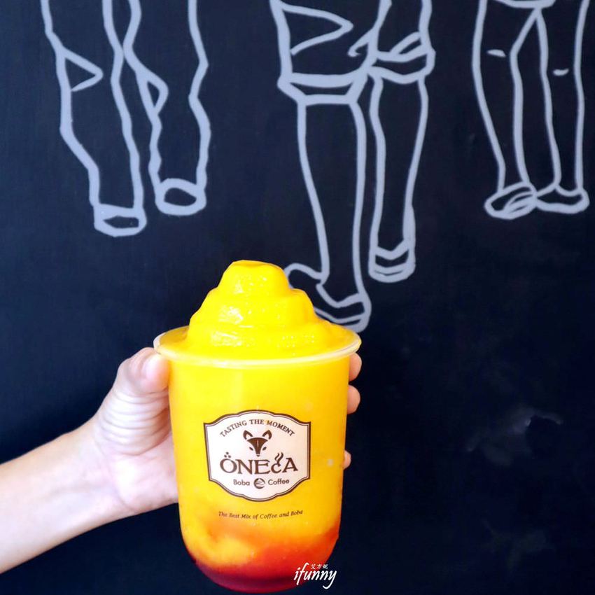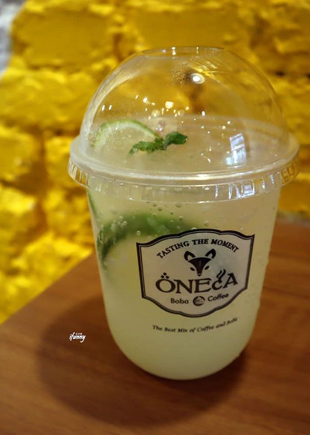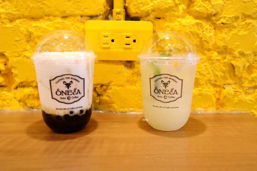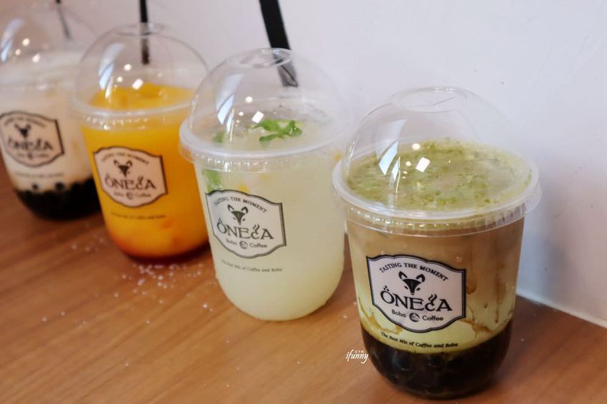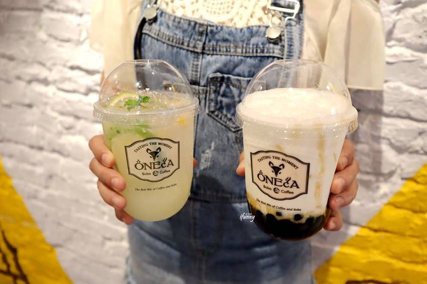 目前ONECA 丸咖販售的飲品以店名的珍珠加咖啡為主打,也有茶品、冰沙、氣泡飲,還有特別的微醺飲品。