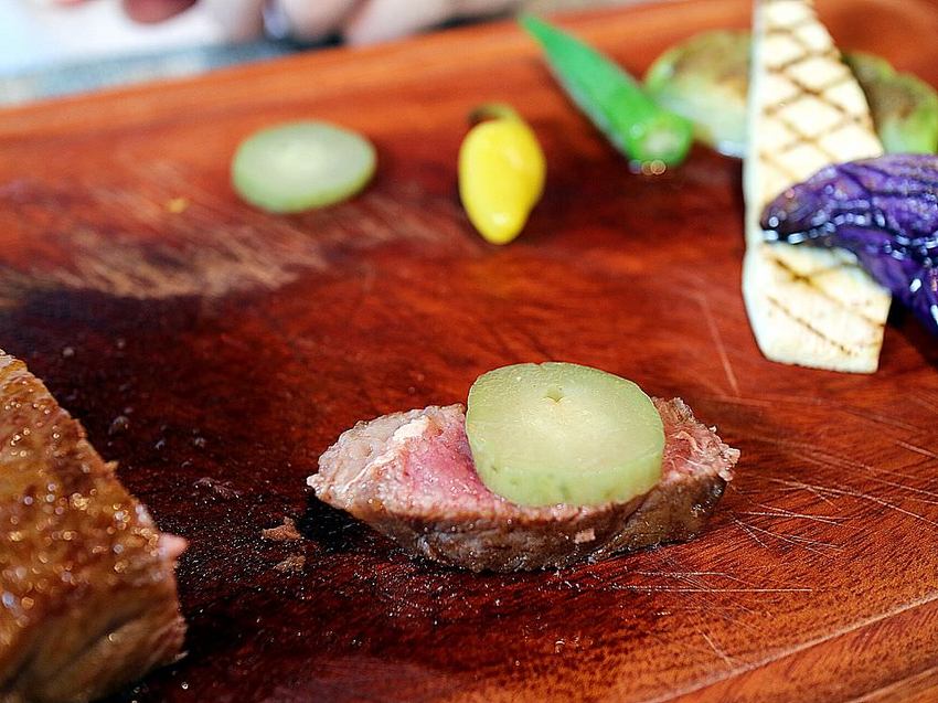 主餐和牛旁 點綴有 新鮮烤蔬食,茄子/玉米筍/筊白筍/番茄/絲瓜/秋葵…
