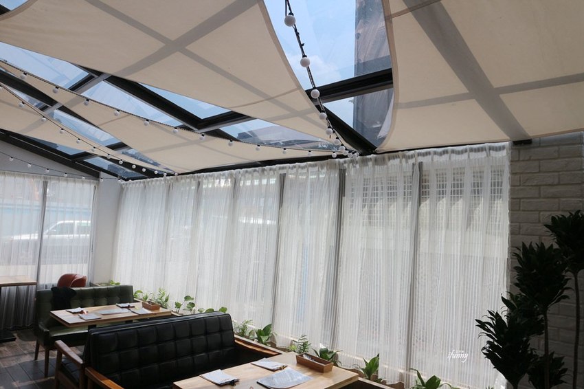 這一區猶如玻璃屋的明亮度是最受歡迎的,其上飾以有如風箏般的帆布,不僅有遮陽的效果,特別的造型搭以燈泡,也有種露營渡假的氛圍。