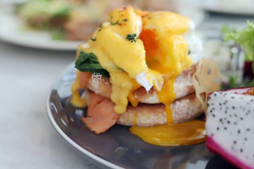尤長是將半熟的蛋切開時,瞬間流下的金黃蛋液更是令人尖叫啊!將蛋黃裹在帶著Q勁的麵包,帶出滑順潤口的好滋味。煙燻鮭魚的鹹香,也令這份早餐更有不同層次的表現。