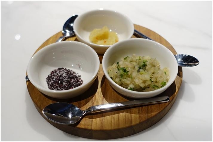 雖然樂軒建議不要再沾調料,可是桌上還是有準備了三種沾醬.柚子鹽適合內臟系,紫蘇鹽比較適合油脂多的部位.蔥鹽最百搭