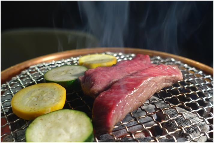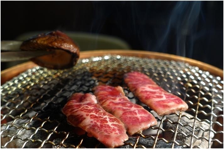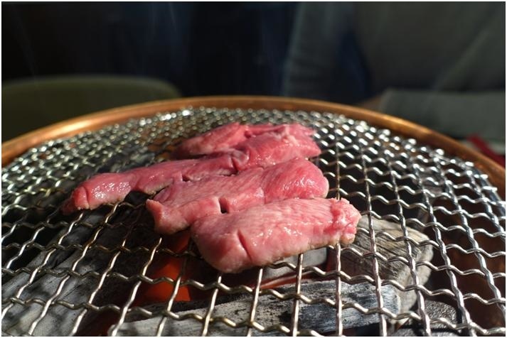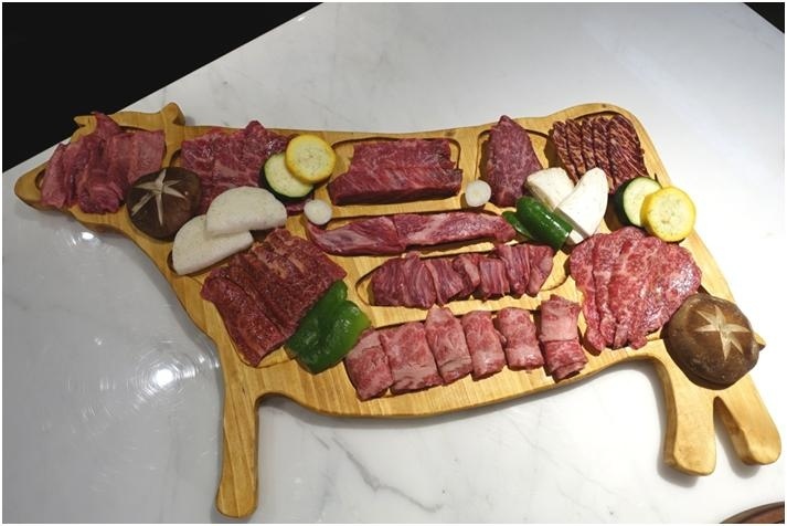 自慢一頭牛可以吃到幾乎所有的部位,這樣的擺盤方式也和桌墊上牛肉部位相呼應..比較可惜是以兩人份蔬菜的份量是有點少.牛肉再上桌前已經有了薄鹽和胡椒的調味.臀肉上蓋和前胸肉則是刷上壽喜燒醬.樂軒標榜的是高檔肉品高級服務.因此每一桌都有專人幫忙烤肉.大部分的服務生都是從各大知名燒烤店聘請來的喔!
