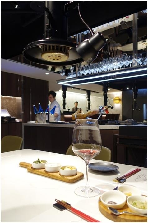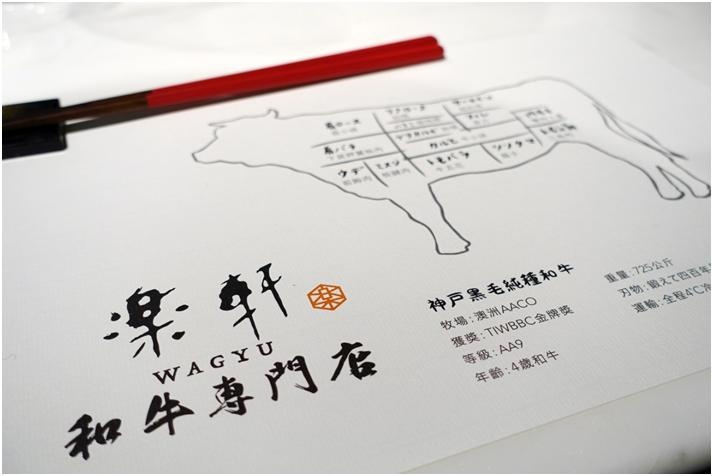 簡單的大理石桌面放了一張印了牛肉部位的餐墊,並告訴顧客樂軒使用的是AACO農場高級的AA9和牛(脂肪含量約40%).Australia Agricultural Company成立於1824年是澳洲最古老,也是提供最多和牛的公司.AACO除了自己有一套嚴格的油花檢驗及分級制度之外,也有ISO9001認證確保每一塊牛肉的衛生及安全.