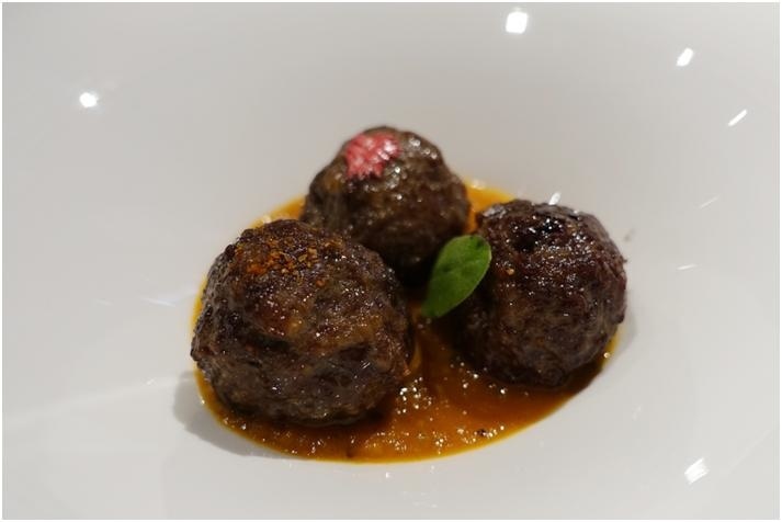 以匈牙利醬襯底的三個丸子是有食用順序的.依口味的淡到重依序食用.有著綠色蝦夷蔥的是原味,撒上七味粉的肉丸當中包著起士,最後面有花瓣點綴的則是包裹著松露.