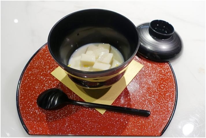 甜點是清爽的自製豆漿豆腐點綴一點點的燕窩.溫熱的豆漿帶了點菊花的香氣和冰糖的甜.豆腐不到欣葉杏仁豆腐那麼Q彈可是又比一般豆腐更綿密有彈性.
