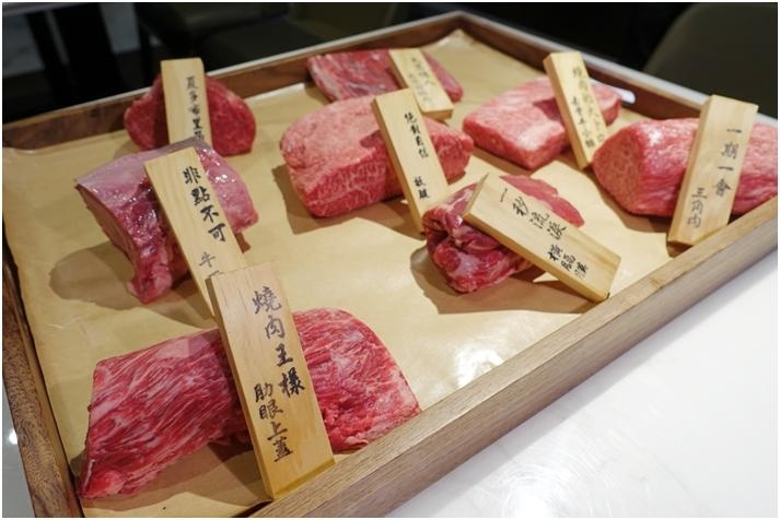 坐下來之後店員會拿出一盤像這樣的肉來介紹,這些都是可以單點的.只是我早在來的時候就看好一定要點自慢一頭牛套餐 (NT4800,含開胃小品,沙拉,湯 ,白飯,10種不同的和牛部位,和牛炒飯,甜點).為什麼AACO的牛肉可以4度C空運「冷藏」來台不怕壞呢? 因為這裡的和牛的基因屬於油花比較密集的,單元不飽和脂肪酸遠高於其他肉品(也就是有很多對人體有益的Omega3 ep Omega6)相較於美國牛60~70天的保存期AACO的和牛可以保存150天!!從這盤牛就已經可以期待等等上桌的肉會有多好吃了.很清楚的看到不同的部位,油花的分布很不一樣.但可以確保的是每一塊肉都有大理石以上等級的油脂分布!