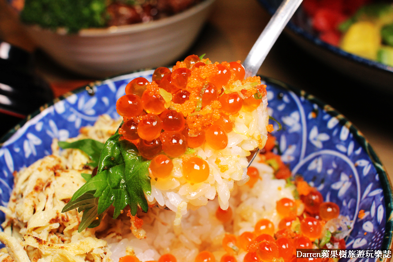 視覺焦點當然就是擺在拌飯上面有滿滿的鮭魚卵加蝦卵,還有蛋絲來搭配然後加上特調醬汁,外觀看來美美der