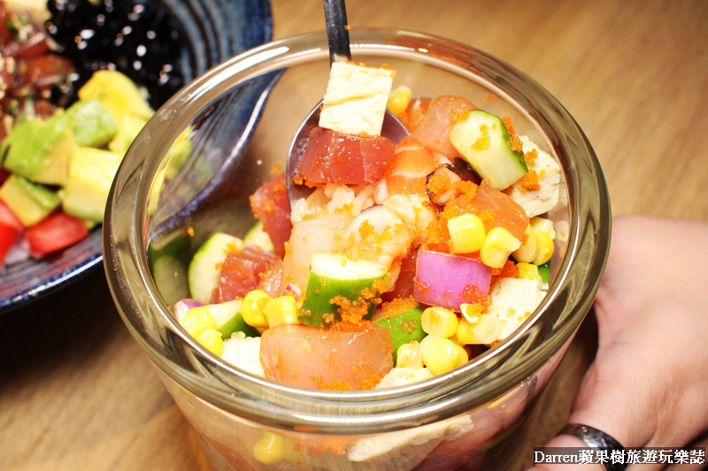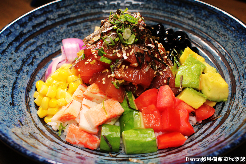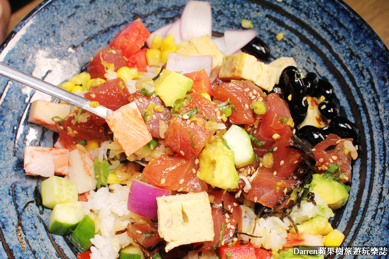 拌飯加入些許麻油所以吃起來帶點麻油香氣,Q彈嫩口的鮪魚加上酪梨、洋蔥、蟹肉棒、玉米、玉子燒等配料