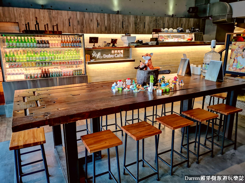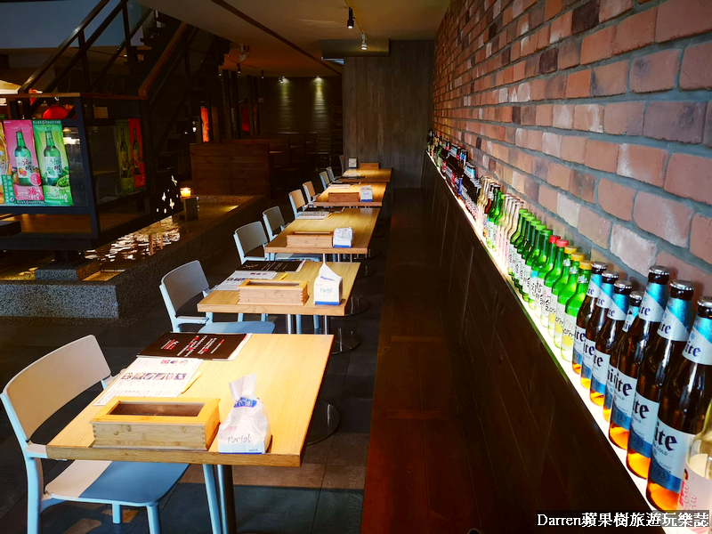 剛好店內有賣許多韓國飲料,玻璃瓶放在間接照明上面剛好變成裝飾,木質裝潢加上紅磚灰色牆面帶點輕工業風