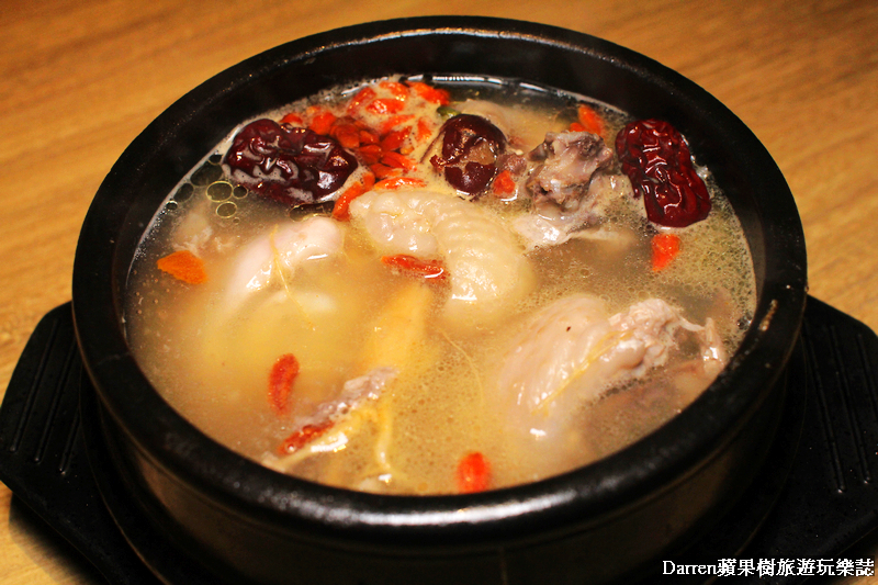 熱呼呼的蔘雞湯入口超級暖胃,土雞腿肉Q彈有嚼勁,不會有很重的中藥味,喜歡喝湯的朋友可別錯過了唷