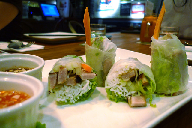 生春卷內包了烤豬肉,附了兩種沾醬可以使用
