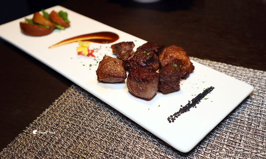 骰子Prime牛小排佐紅酒醬 - 骰子牛煎的外酥內嫰,咬下後帶有湯汁,香嫰美味,而主廚特別選用的高優質黑鹽及調配的紅酒醬,沾著吃能將口感帶出不同的層次感。