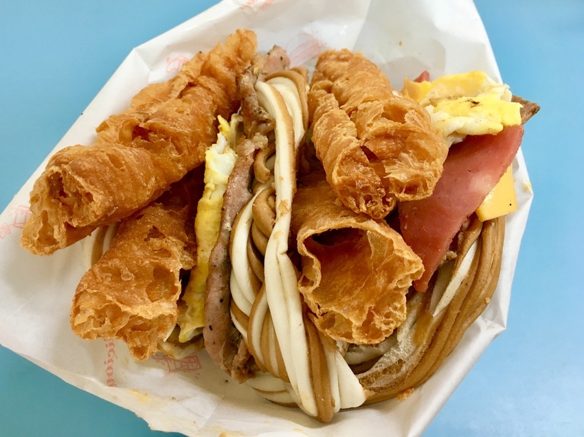 配料有雙色饅頭、油條、黑胡椒豬排、蔥花蛋、火腿、起司