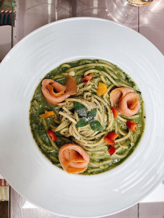青醬燻鮭魚義大利麵+多重起司雞肉帕尼尼+百香鳳梨冰茶+八月桂花香+生巧克力🔻