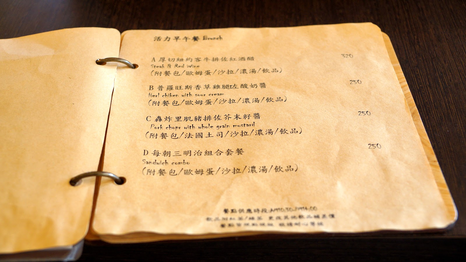在路邊看著的招牌上的餐點,心裡想著這也許跟一般有販售餐點的咖啡廳會不會沒有什麼兩樣呢。進去坐下之後接待的服務人員親切的介紹下午茶時間現正推出春雞套餐,因著晚上還有飯局選擇了義大利麵與熱狗堡。