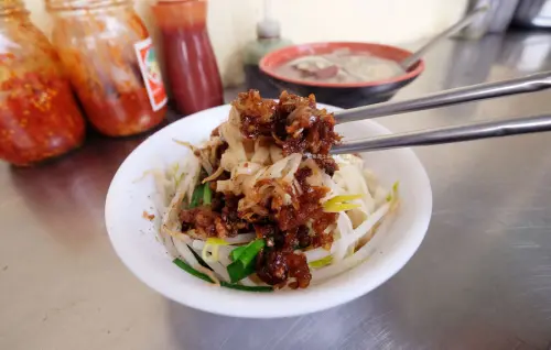 上頭配菜滿多的,有豆芽菜、小黃瓜絲、酸豆角、紅蘿蔔絲、花生