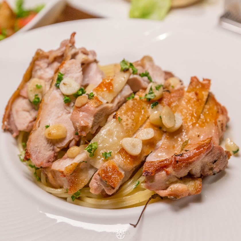 選用新鮮整隻的雞大腿加入大蒜與百里香醃製兩天後,以大火煎至表皮金黃配上俗稱煮不爛的義大利麵以蒜頭爆香後再加入高湯煨煮入味後,酥脆的雞腿表面搭上軟嫩的雞肉配上以蒜頭爆香炒過的義大利麵簡直絕配。