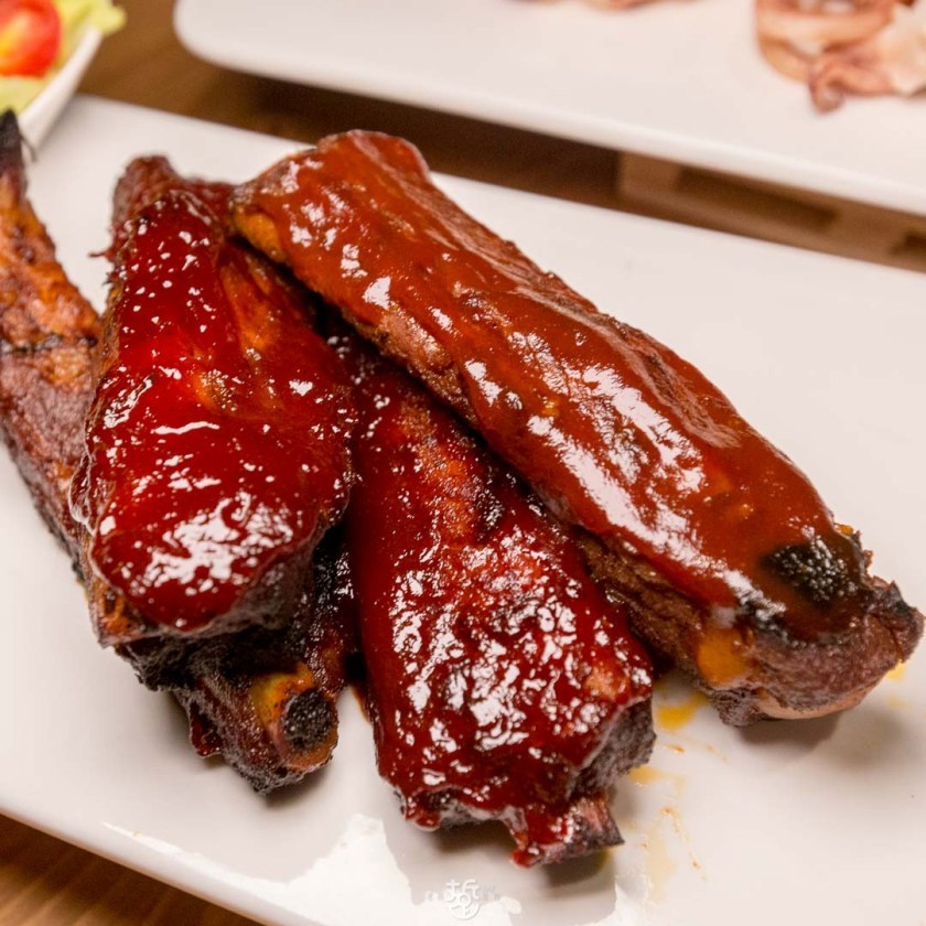 以新鮮的西芹和洋蔥醃製兩天去掉豬特有的腥味,以大火煎至表皮金黃再加上紅蘿蔔,西芹,巴西里,洋蔥,蒜苗,高湯,放入140度烤箱,烤隔夜後,再加入主廚密制的BBQ醬汁大火快烤後,外表濃厚的醬汁味道搭上軟嫩多汁的豬肋排,再來一杯啤酒,真的,人生不過如此而已