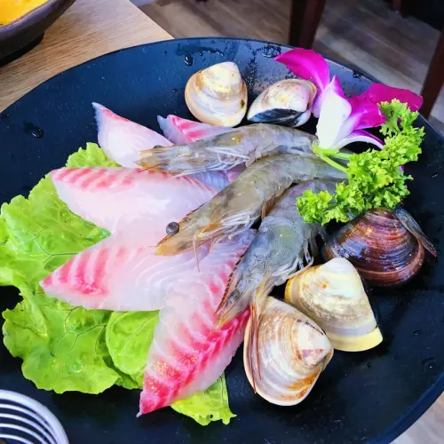 肉品有牛、豬、羊、雞跟櫻桃鴨搭配海鮮盤白蝦五隻、鯛魚跟蛤蜊
