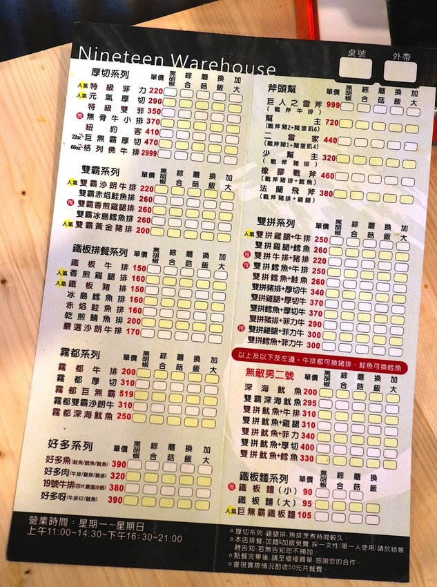 《19號倉庫鐵板牛排-仁德店》菜單