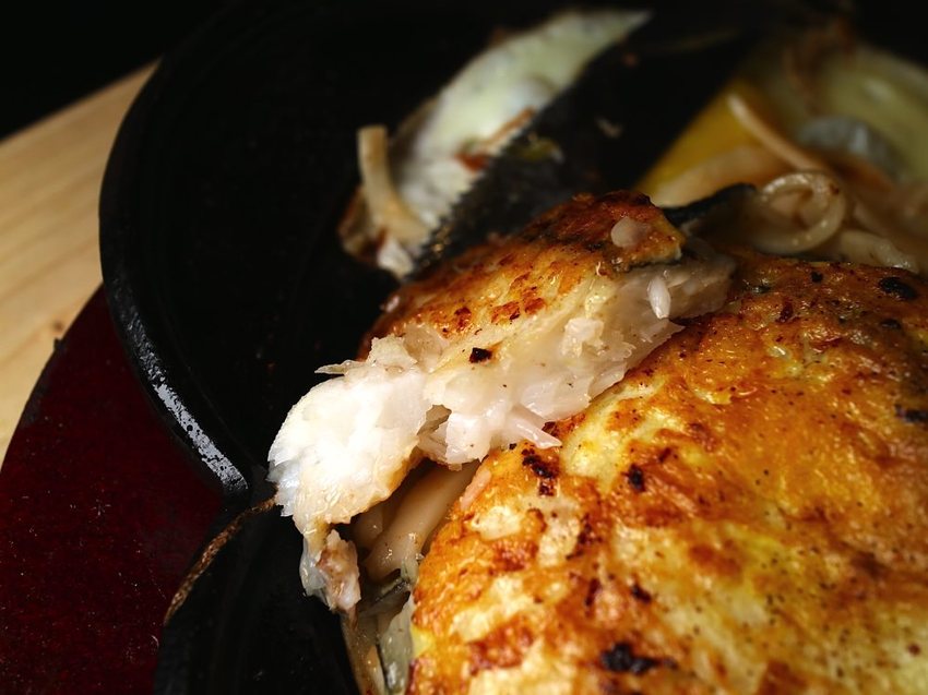 鱈魚排表面有沾上蛋汁去煎,帶著一層蛋皮,吃起來更加香嫩!