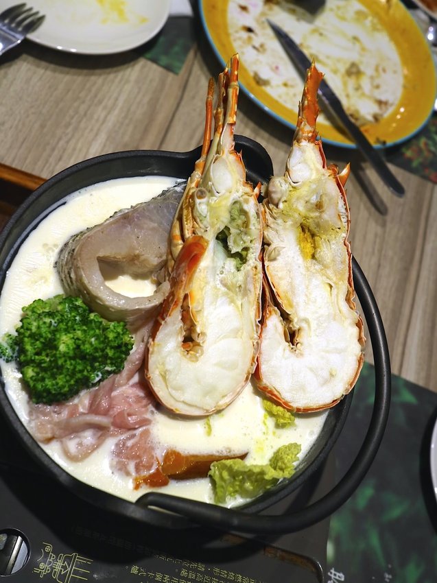 新鮮的蔬菜、菇類和豬肉,搭配頂級海鮮:美國小龍蝦、石斑魚,牛奶鍋湯底,是鍋澎拜的海陸饗宴。