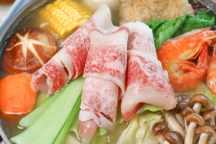在大門口就相中的”隱藏菜單/頂級A5和牛火鍋套餐”,廚師已將火鍋料、白蝦、蔬菜、菇類…等食材,先放進去煮至六分熟,讓客人只要再加熱一會兒就能品嚐