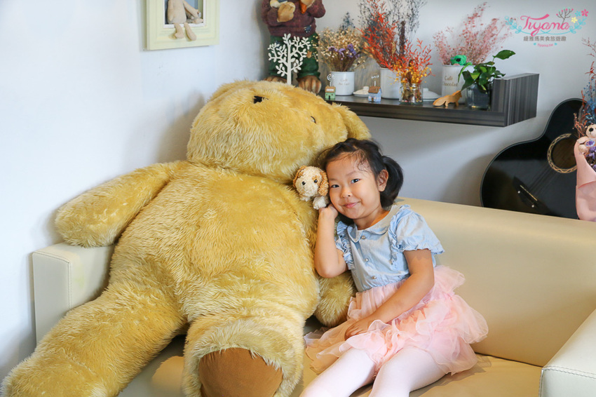 \步入店內吧檯右邊,佈置有童趣乾燥花、大熊坐陪的小沙發和閃閃發亮的巴黎鐵塔,這裡是店內第2個最佳打卡點