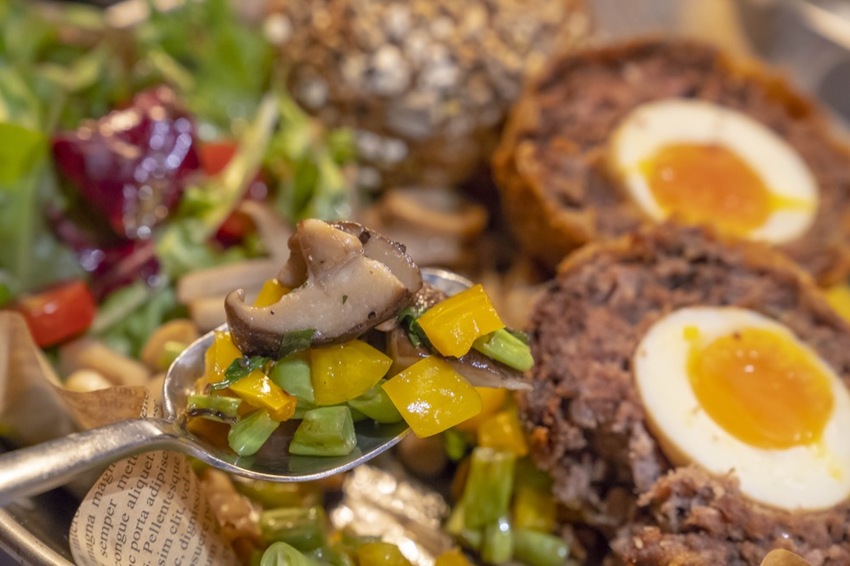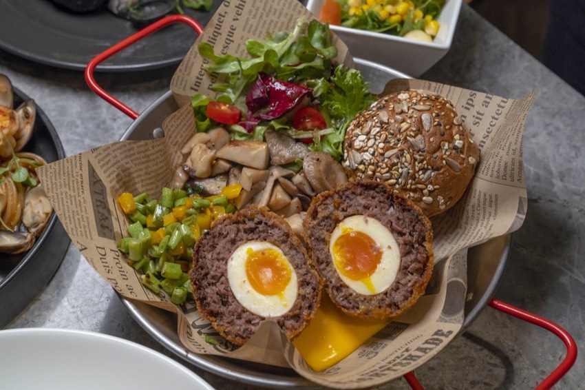使用牛肉排的餡料包裹著溏心蛋再下鍋油炸,即便冷了也不油膩