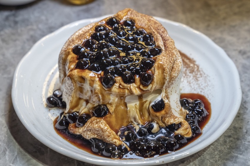 像水流般的黑糖珍珠從鬆軟的舒芙蕾緩緩流下
