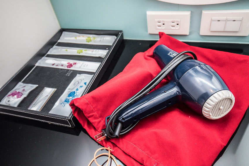 一旁是梳妝台跟大型的衣櫃,獨立吹風機跟盥洗備品,咬咬還蠻喜歡獨立吹風機的,有些是固定在牆壁上,不能四處移動,想要邊吹頭髮邊看電視也不方便