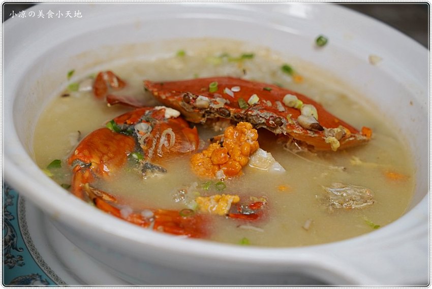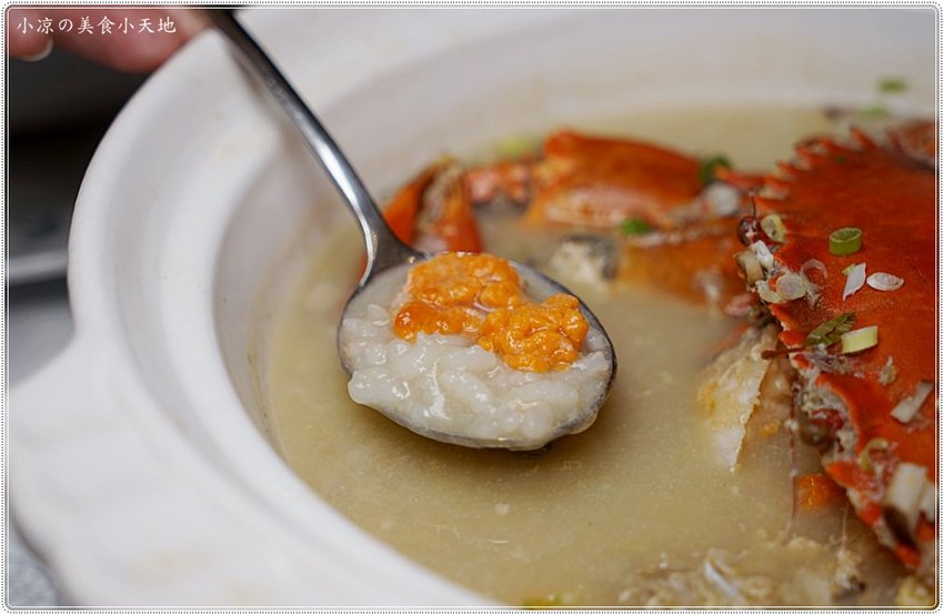 紅蟳內的蟹膏鮮味完全融於粥品內,湯頭鮮甜醇美的風味,粥品綿糯香滑,稠稀適度…