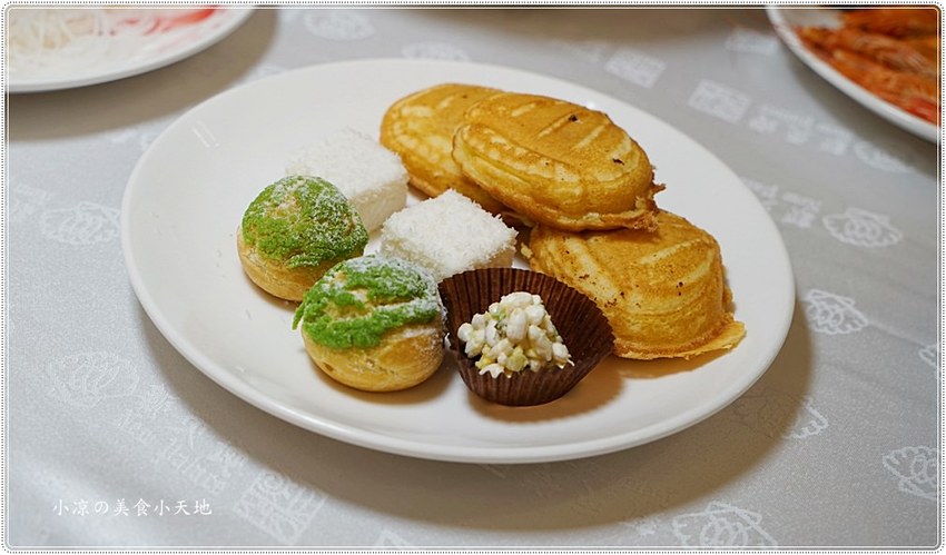避風塘炒蝦、起士牛肉丸、羊膝、爐烤豬肋排、蒸蛋、銀耳蓮子甜點、番茄起司盤等等