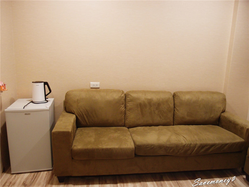 沙發旁的小冰箱,上面有個熱水壺,不過我們當天都沒用到