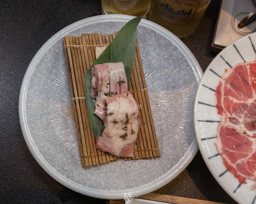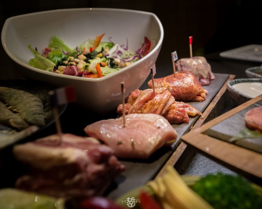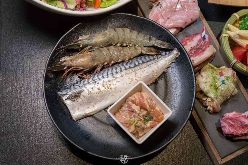 除了七種各國風味的肉品,還有鮮蔬沙拉、牛舌、雞松阪、深海大蝦及鯖魚。牛舌用的是舌根部位,相當軟嫩,沾點玫瑰鹽就相當好吃。