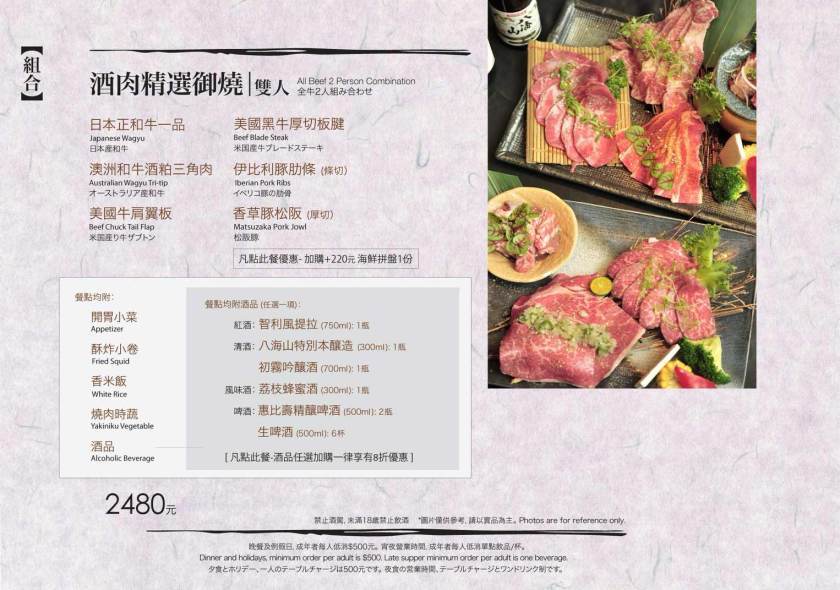 酒肉,酒肉,有肉當然要有酒。紅酒、清酒、風味酒、啤酒,四種選一種。