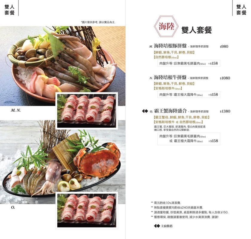 這次老莫要推薦的餐點是霸王蟹海陸盛合 $1380。雙人份量,鍋底是麻油湯底與蕃茄湯底。有海鮮盤與肉盤,另外還可加價升級肉品。