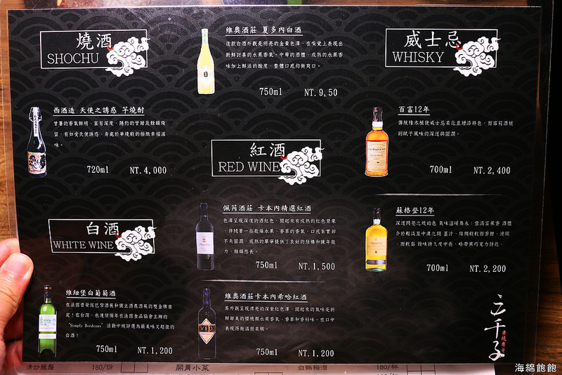 三千子居酒屋提供啤酒、清酒、燒酒、紅白酒及威士忌